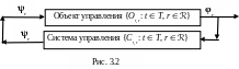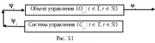 В каждый фиксированный момент времени t с помощью приборов измеряются результаты объекта управления Or и системы управления Cr. Показания приборов в момент t для результатов объекта управления Ot, r является значением некоторого вектора r(t) Z, а показания приборов в момент t для результатов системы управления C t, r является значением некоторого вектора r(t) Y. Здесь Z и Y некоторые заданные множества. Отсюда семейство r {r(t): t T} и семейство r {r(t): t T} являются детерминированными математическими моделями измерителей выхода объекта управления Or и соответственно измерителей выхода системы управления Cr. Поэтому мы можем интересоваться отдельно объектом управления Or или свойствами семейства r и системой управления Cr или свойствами семейства r. Более того, в общем случае семейство r является входом (исходной основной характеристикой) для системы управления Cr, а семейство r будет входом (исходной основной характеристикой) для объекта управления Or. Если результаты объекта управления Or не влияют на результаты системы управления Cr, то мы имеем дело с так называемой управляющей системой E без канала обратной связи. В противном случае эта система E функционирует с каналом обратной связи. Схема модели управляющей системы {(Ot, r, Ct, r): t Î T, r ℛ} без канала обратной связи приведена на рис. 3.1, а схема модели управляющей системы {(Ot, r, Ct, r): t Î T, r ℛ} с каналом обратной связи отображена на рис. 3.2. Ошибочно объявлять семейство векторов {(r(t), r(t)): t T} детерминированной математической моделью управляющей системы Er. На самом деле следующее векторное семейство {(r(t), r(t)): t T} является всего лишь удобной детерминированной математической моделью совместного функционирования во времени tÎT выхода системы управления и выхода объекта управления, а не детерминированной моделью всей управляющей системы Er в целом.