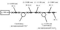 Здесь резонатор лазера образован лишь одной парой решеток, что позволяет предполагать взаимную когерентность излучения на разных длинах волн. Полупроводниковый лазер с длиной волны около 980 нм и максимальной мощностью 4 Вт используется для накачки волоконного лазера на основе световода с двойной оболочкой, легированного ионами Yв3+ .