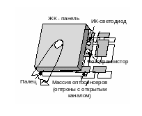 Инфракрасный поток проходит через структуру ЖК-дисплея и, отразившись от пальцев оператора, опять проходит через ЖК-панель и попадает на фотодатчики. Без ЖК-дисплея до 20% энергии возвращается к фотодатчику, отразившись от объекта, находящегося на расстоянии до 100 мм. При наличии ЖК-панели между излучателем и объектом, за счет поглощения, порог чувствительности для обнаружения движения пальцев над поверхностью ЖК-панели понижается до 10 мм. Схема приведена на рис. 8.21.