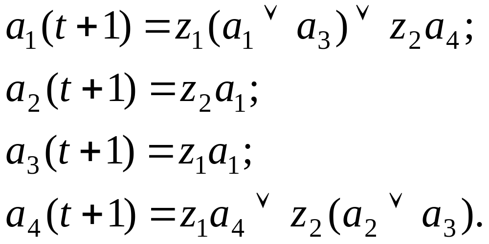 a1(t+1) = z1a3 Ú z1a4; a2(t+1) = z1a1 Ú z1a2; a3(t+1) = z2a2 Ú z2a4; a4(t+1) = z2a1 Ú z2a3. |