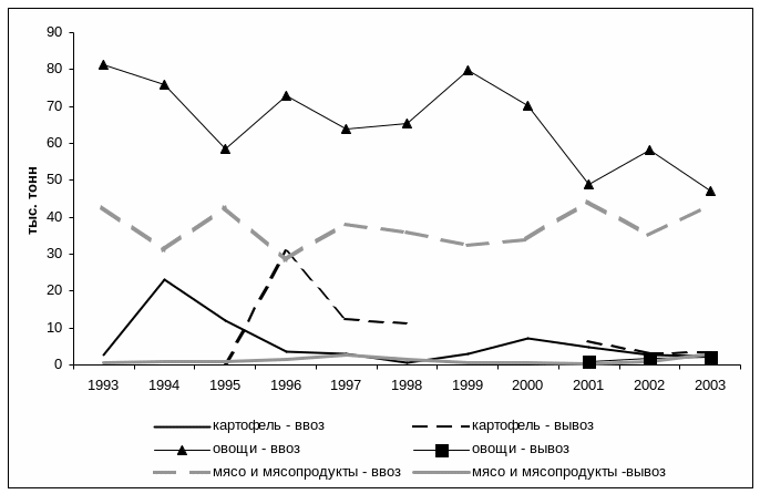 Рис. 10. Тюменская область: ввоз (вкл. импорт) и вывоз (вкл. экспорт) картофеля, овощей и мясопродуктов.