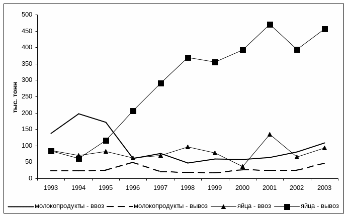 Рис. 11. Тюменская область: ввоз (вкл. импорт) и вывоз (вкл. экспорт) молокопродуктов и яиц, 1993-2003 гг. (тыс. тонн).