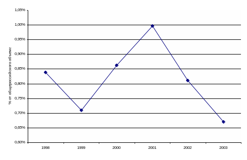 Рост производства бутадиена был ниже роста промышленности РФ и нефтехимической промышленности РФ и превысил их только в 2003 г.; в 2001 - 2002 гг. происходило снижение темпов роста, и наметился спад (0,4%); в 2003 г. рост составил 11,7%.