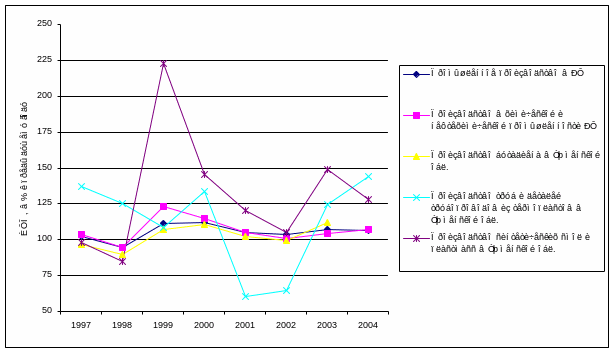 Анализ динамики индексов физического объема (ИФО) по товарным группам нефтехимического сектора Тюменской области на отрезке 1997-2003 гг. показывает: