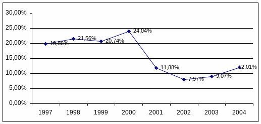 Рост производства синтетических смол и пластмасс был неустойчивым: пережил пик в 1999 г. и резкое снижение в 2000-2002 гг. (до уровня роста промышленности РФ); в 2003 г. рост превышал рост промышленности РФ на 41,8%; в 2004 наметилось снижение темпов роста (лишь 28,3% к 48,8% в 2003 г.).