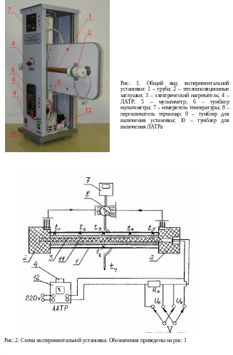 В центре трубы находится электрический нагреватель 3, подключённый через образцовое сопротивление RO к источнику переменного напряжения 12 (ЛАТР). Напряжение на нагревателе UН и падения напряжения на образцовом сопротивлении UО измеряется вольтметром 5. Нагреватель 3 размещается в медном цилиндрическом термостате 11.