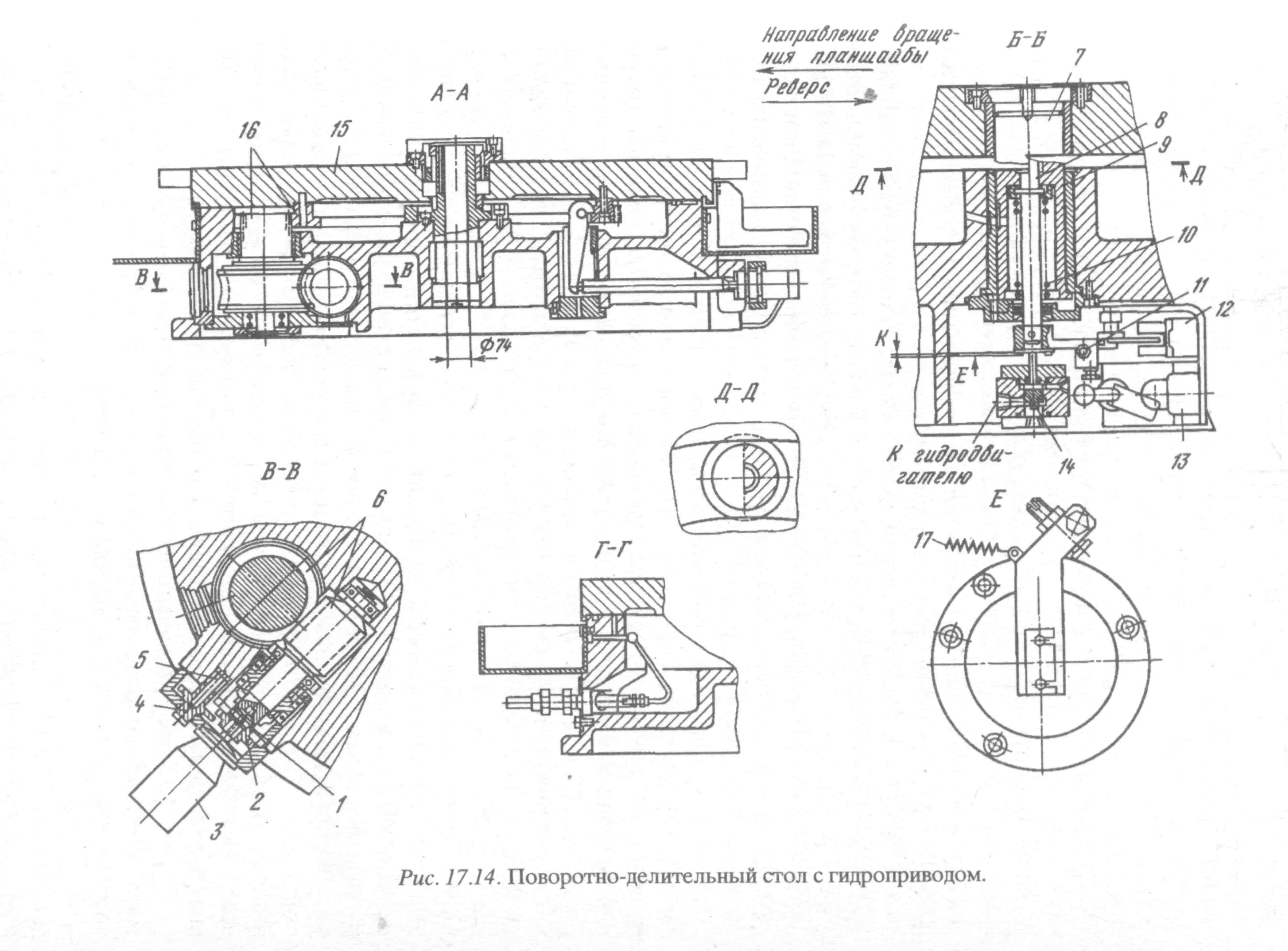 Кинематическая схема делительного стола с гидроприводом приведена на рис. 17.13, а конструкция стола - на рис. 17.14. Планшайба 15 поворачивается гидродвигателем 3 через червячную передачу 6 и цилиндрическую - 16. В конце поворота упор 7 наезжает на подвижный фиксатор 9, который при ходе вниз воздействует на выключатель 13 и