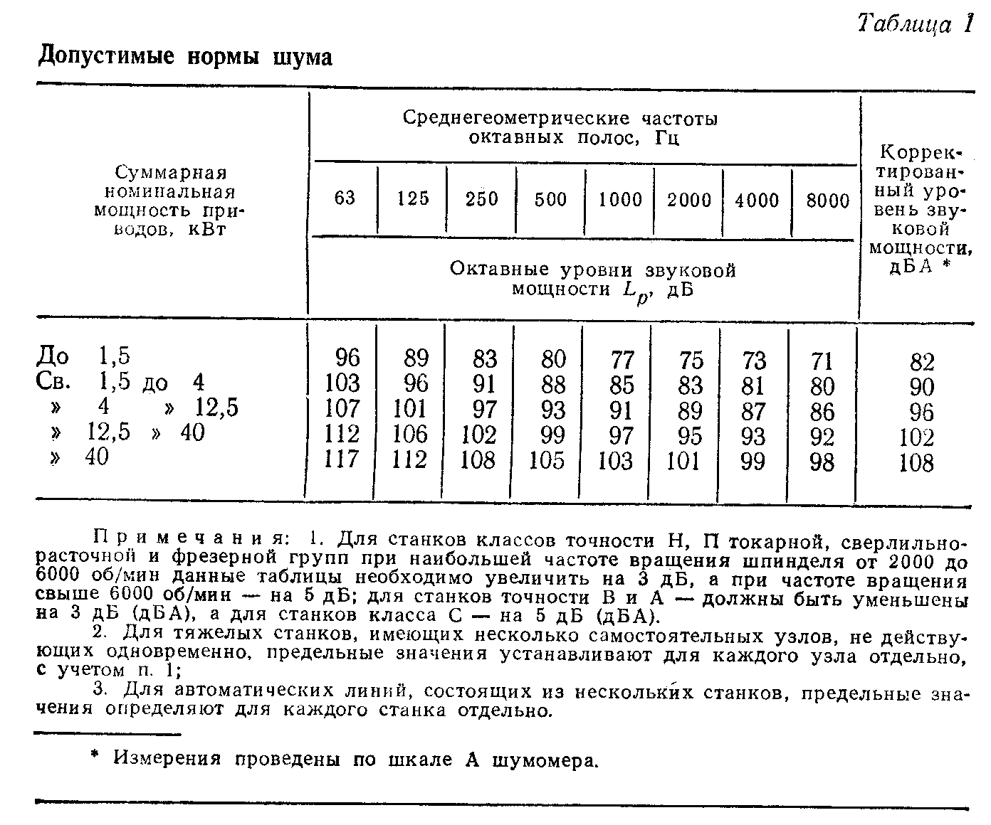 Для более полной оценки действия шума на человеческий организм необходимо разделять шумы в зависимости от их частоты, так как уровень шума не определяет полностью степень раздражающего действия на человека. Для каждой частотной группы установлен свой допустимый уровень шума (табл. 1). Кроме того, учитывается также номинальная суммарная мощность приводов станка, одновременно работающих в процессе рабочего цикла.