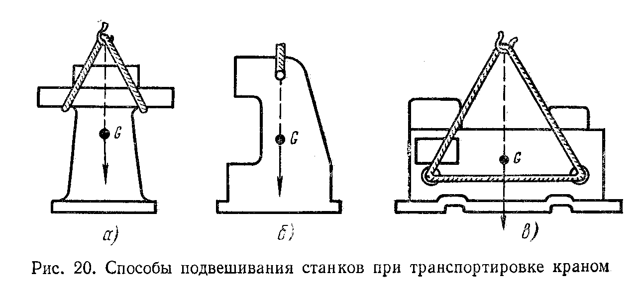 16. Обеспечивать удобное подвешивание и устойчивое положение тяжелых деталей, узлов и станка в целом при переносе их краном во время сборки и установки. Если станок или его тяжелую деталь удобно при переносе захватывать канатом (рис. 20, а), то не надо предусматривать специальные устройства, облегчающие подъем и транспортирование. В противном случае на станке необходимо иметь грузовые винты, отверстия и т. п. Один грузовой винт или одно отверстие допустимо и достаточно иметь на станках и деталях, имеющих по сравнению с высотой небольшую длину (рис. 20, б). Место подвеса должно быть расположено значительно выше центра тяжести и лежать с ним на одной вертикали. У станков и деталей удлиненной формы и в тем случае, когда точку подвеса по конструктивным соображениям нельзя расположить в требуемом месте, предусматривают два грузовых винта или два отверстия (рис. 20, в).