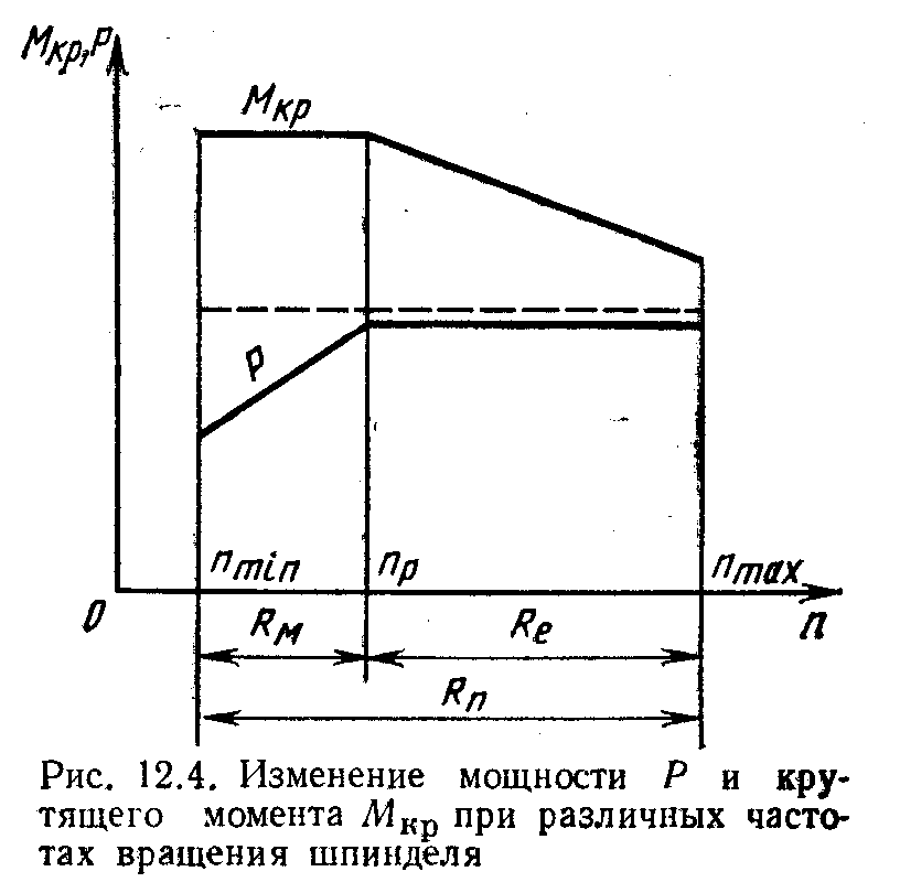 При обработке на станке деталей различных размеров величины Fz и v в первом приближении остаются постоянными, переход на чистовые режимы обработки приводит к уменьшению Fz, но к возрастанию v, кроме того, при этом увеличиваются потери на трение. Поэтому желательно (хотя и не всегда возможно), чтобы в приводах главного движения обеспечивалось постоянство передаваемой мощности по всему диапазону Rn (рис. 12.4).