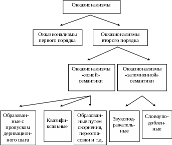 Окказиональные слова целесообразно разделить на две группы в зависимости от продуктивности-непродуктивности языковых средств, использованных при их образовании: на окказионализмы, образованные по продуктивным моделям (окказионализмы первого порядка), и окказионализмы, образованные по непродуктивным моделям (окказионализмы второго порядка).