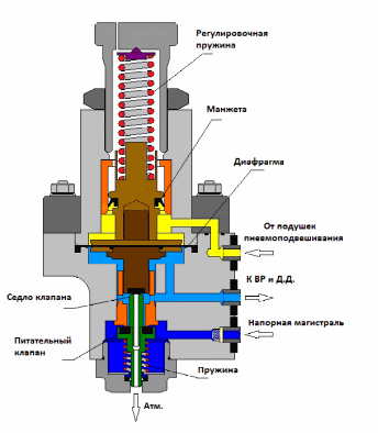 При поступлении воздуха от подушек пневмоподвешивания в управляющую полость над диафрагмой, диафрагма прогибается вниз, воздействуя на клапан. Клапан открывается и подключает напорную магистраль к полости под диафрагмой и, соответственно к делителям давления и к воздухораспределителю. После того как давление под диафрагмой уравняется с давлением над диафрагмой и усилием регулировочной пружины – диафрагма начнёт прогибаться вверх, воздействие её на клапан ослабнет и клапан под давлением пружины займет положение перекрыши. Соединение напорной магистрали и полости под диафрагмой прекратится.