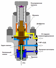 При снижении давления в трубопроводе к делителям давления и воздухораспределителю соответственно снизится давление и в полости под диафрагмой, она прогнётся вниз, откроет клапан и произойдёт подпитка полости под диафрагмой, после чего клапан опять займёт положение перекрыши.