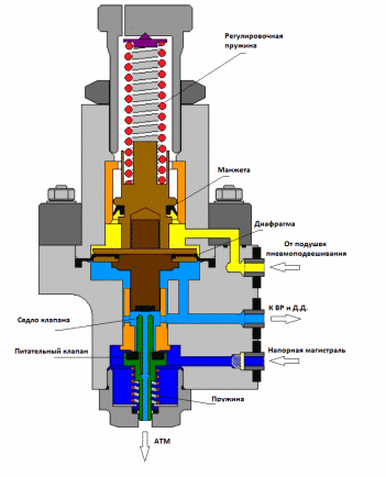 Воздух из напорной магистрали поступает в полость под клапаном 18. Воздух от подушек пневмоподвешивания поступает через канал в корпусе в полость над диафрагмой 29. Воздух из полости под диафрагмой поступает через канал в корпусе к делителям давления и воздухораспределителю.