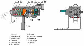 При запрещающем сигнале светофора скоба автостопа находится в заграждающем положении и при наезде на нее скоба отклоняется влево, перемещая эксцентрик 5 который, воздействуя на толкатель , перемещает поршень вправо. Происходит разрядка ТМ в атмосферу экстренным темпом через открытую заслонку.