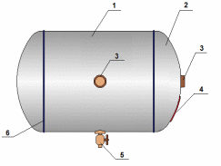 1.Цилиндрическая обечайка; 2. Сферические днища; 3. Штуцер; 4. Паспортная табличка; 5. Сливной кран; 6.Сварной шов.