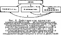 Согласно теории управления усвоением знаний каждое действие представляет собой единство трех частей: ориентировочной, исполнительной, контрольно-корректировочной. Ориентировочная часть выполняет функции программы действия, на основе которой осуществляется исполнительная часть; параллельно с исполнением осуществляется контроль: результаты действия сопоставляются с заданием программы и оценивается продвижение к цели. Если обнаруживается рассогласование между ориентировочной и исполнительной частями действия, то в последнюю вносятся коррективы, если эти части действия согласованы, но продвижение к цели неудовлетворительно, то корректируется ориентировочная часть действия (рис. 6). Обучение наиболее эффективно, если учитель управляет формированием ориентировочной части, основы действия.