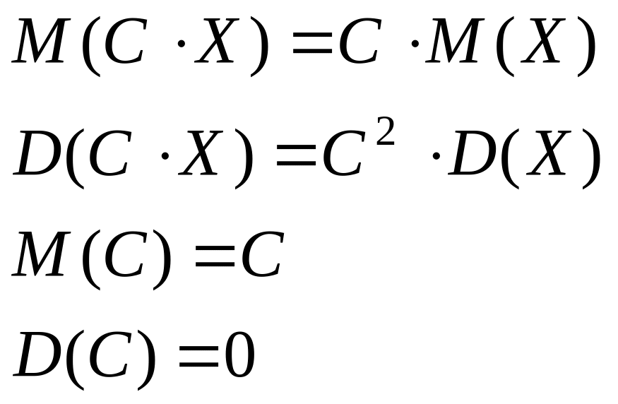 где С – число. Последние два свойства легко запомнить: математическое ожидание константы равно самой этой константе как ее среднее значение. Дисперсия константы равна нолю, т.к. дисперсия характеризует разброс значений относительно среднего, а разброс относительно постоянного числа отсутствует.