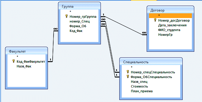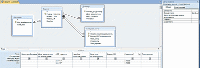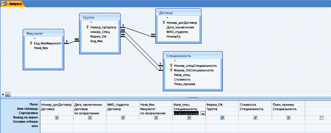 Пример 1. Создадим запрос, содержащий информацию о договорах оплаты за обучение с указанием фамилии студента, даты заключения, факультета, специальности, стоимости обучения, плана приема.