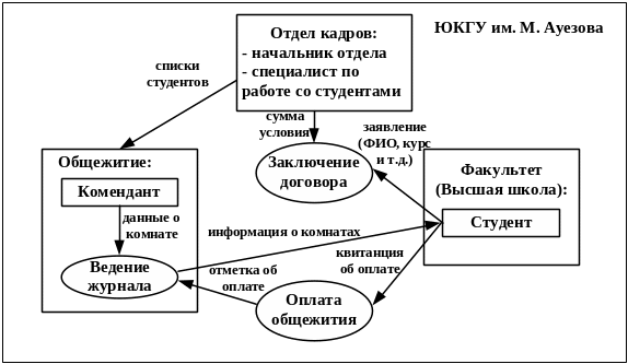 2. Когда абитуриент зачислен (далее студент), он пишет заявление. На основании данных заявлений (ФИО студента, курс, специальность, факультет) заключаются договора и подготавливаются места в общежитии. Распределение заключается в том, что каждому студенту распределяется комната, о чем свидетельствует запись в журнале коменданта общежития.