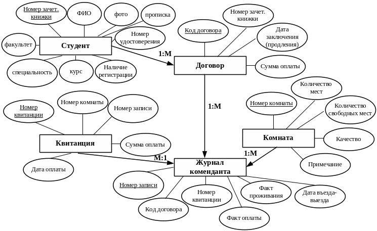 4. Журнал коменданта (Номер записи, Номер комнаты, Код договора, дата въезда-выезда, факт проживания, факт оплаты, номер квитанции).