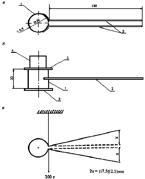Размеры кольца и индикаторных игл должны соответствовать указанным на рисунке. Для облегчения расформовки кольцо может иметь скобы, припаянные с наружной стороны и расположенные выше индикаторных игл. Упругость кольца должна быть такой, чтобы под действием усилия, создаваемого грузом массой 300 г, приложенного в середине прорези кольца, как показано на рисунке 7, расстояние между концами индикаторных игл увеличилось на (17,5±2,5) мм без постоянной деформации.