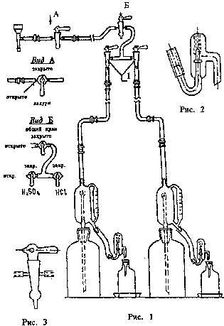 Бутыль А служит для хранения больших количеств жидкостей. Через резиновую пробку Б пропущены две стеклянные трубки. Трубка В не доходит до уровня жидкости и соединяет воздушное пространство в бутыле с насосом (поз. 4) и атмосферой через переходник Г. В переходник встроен обратный клапан с ниппелем, пропускающий воздух только в направлении стрелки, указанной на корпусе переходника. Трубка Д опущена в жидкость и вместе со шлангом Е образует сифон.