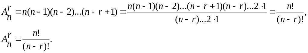 Здесь n, n-1, n-2,…,n-r+1 есть число возможностей для выбора первого, второго, третьего,… r – того элементов.
