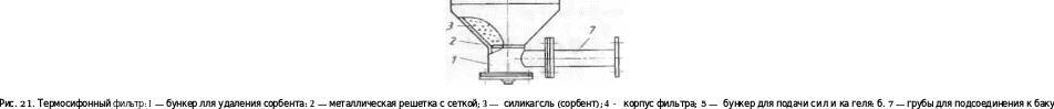Адсорбционные масляные фильтры предназначены для непрерывной регенерации масла трансформатора в процессе его эксплуатации с циркуляционной (Ц) и дутьевой циркуляционной (ДЦ) системами охлаждения, обеспечивающими принудительную циркуляцию масла через фильтр. Аналогичные фильтры на трансформаторах с естественной масляной (М) и дутьевой (Д) системами охлаждения, когда циркуляция масла в фильтре обеспечивается только за счет разностей плотности нагретого и охлажденного масла, называют термосифонными (рис. 21). Количество сорбента в термосифонном фильтре должно составлять около 1 % массы масла в трансформаторе.