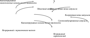 Непрерывные сигналы с переключением несущей частоты - максимальная энергетика при ограничении излучаемой мощности. Хорошие (но в число переключений хуже предыдущего сигнала) точность и разрешающая способность по доплеровскому сдвигу частоты. Улучшенные точность и разрешающая способность по дальности за счет расширения реального спектра сигнала, но резкое усложнение обработки.