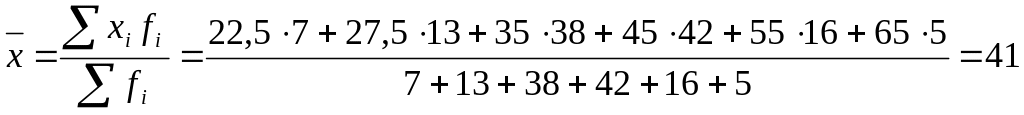 Для определения среднего возраста работника найдем середины возрастных интервалов. При этом величины открытых интервалов (первого и последнего) условно приравниваются к величинам интервалов, примыкающих к ним (второго и предпоследнего). Середины интервалов будут следующими (xi ):