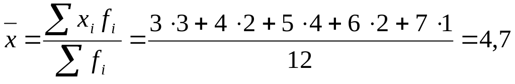 В нашем примере одно и то же значение признака (стаж работы) встречается несколько раз. Объединив данные по величине признака и подсчитав число случаев повторения каждого из них, проведем расчет среднего стажа по сгруппированным данным с помощью формулы средней арифметической взвешенной: