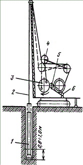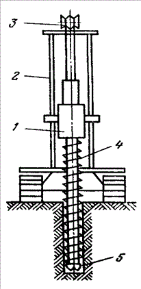 Станки вращательного бурения резцовыми коронками имеют вращатель 1, своими лапами скользящий по вертикальным направляющим 2. Подъем вращателя производится лебедкой с помощью подъемного каната, образующего полиспаст 3. В патроне вращателя укрепляется шнековая штанга 4 с прикрепленной к ней коронкой 5. Разрушенная порода удаляется из скважины на поверхность шнеком.