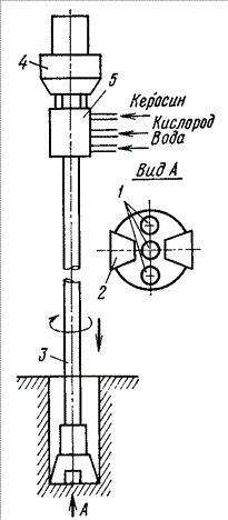 Схема станка термомеханического бурения показана на рис. Станок оснащен термошарошечным рабочим инструментом. Высокотемпературные газовые струи, вытекающие из сопел 1 термобура, разрушают и ослабляют горную породу на забое скважины. С помощью шарошечного бурового инструмента 2 производится разрушение породы. Термошарошечный рабочий инструмент, закрепленный на штанге 3, вращается с помощью вращателя 4. Рабочие компоненты — керосин, кислород и вода — подаются к входному коллектору 5 на вращателе и далее по каналам в штанге поступают к горелке термобура. Разрушенная порода выносится парогазовой смесью.