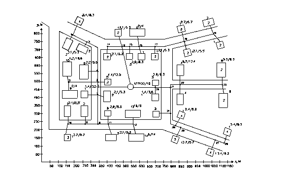 9 Составляем план электрической сети, рисунок 3.2, то есть на плане населенного пункта, рисунок 3.1, наносим условное обозначение трансформаторной подстанции в координатах X, Y, трассы отходящих от ТП линий, номера участков линии, начиная от ТП, расчетные нагрузки для потребителей и их групп. Количество отходящих линий взять исходя из типа подстанции (КТП, КТПБ, КТП ТАС) и ее схемы соединений.