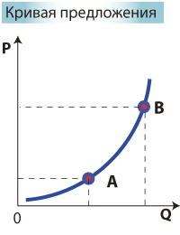 Например, точка А характеризует ситуацию, когда при понижении цены производитель будет предлагать меньше товара, а точка В - наоборот, при повышении цены - больше предлагается товара. Принято откладывать цену по вертикальной оси, а зависимую переменную - объем продажи (предложение) по горизонтальной оси.