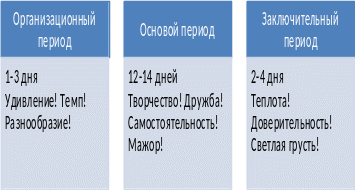 Основные задачи: - прием детей в лагерь, распределение их по отрядам (как правило, по возрастному критерию); - знакомство детей друг с другом, лагерем и его сотрудниками; - коллективное планирование лагерной смены, введение детей в тематику смены; - выявление и выборы актива детского коллектива; - начало работы по созданию благоприятного психологического климата детского коллектива.