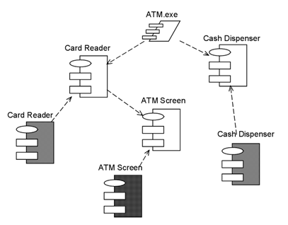Каждый класс модели (или подсистема) преобразуется в компонент исходного кода. После создания они сразу добавляются к диаграмме компонентов. Между отдельными компонентами изображают зависимости, соответствующие зависимостям на этапе компиляции или выполнения программы.