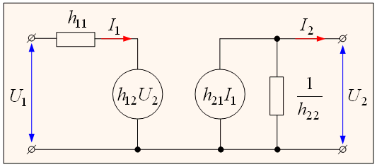 Если две величины считать независимыми, то две другие будут зависимы от них. Существует несколько систем вторичных параметров транзистора: Y – параметры, Z – параметры,H- параметры.Для транзисторов чаще всего используются H – параметры, так как они наиболее удобны для измерений.Для системы H-параметров в качестве входных параметров задаются ток I1 и напряжение U2, а в качестве выходных параметров рассчитываются ток I2 и напряжение U1, при этом система, описывающая связь входных I1, U2 и выходных I2, U1 параметров, выглядит следующим образом: