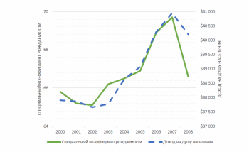 Уровень благосостояния также определяет рождаемость. С античных времен отмечено, что в семьях богатых людей детей меньше, чем в семьях бедняков. А.Смит подчеркивал, что «бедность благоприятствует размножению», [27] но сегодня в развитых странах соотношение «ниже благосостояние – выше рождаемость» нарушается. Классическим примером действия данной тенденции можно считать снижение рождаемости в США в период «великой депрессии». Это феномен наблюдается и сегодня в развитых в экономическом отношении странах. Действие данной тенденции можно объяснить тем, что в современном обществе повышение благосостояния семьи всегда сопровождается расширением круга внесемейных интересов, увеличением расходов на содержание и воспитание детей. Взаимосвязь между специальным коэффициентом рождаемости (СКР) и доходом на душу населения в США представлено на рис. 2.