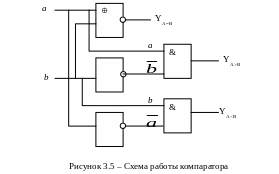 Таблица истинности (таблица 3.3) отражает логику работы 1-го разряда схемы сравнения при сравнении двух векторов А и В. На рисунке 3.5 показана структурная схема компаратора.