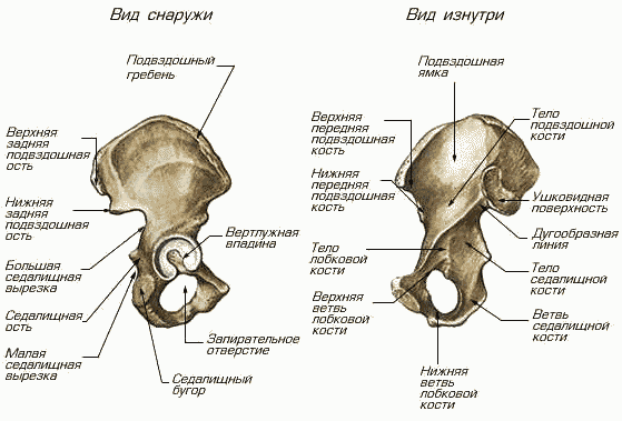 СЕДАЛИЩНАЯ КОСТЬ расположена снизу-сзади относительно вертлужной впадины.В строении седалищной кости также выделяют тело, которое участвует в образовании вертлужной впадины, и ветвь.В месте соединения тела и ветви седалищной кости находится массивное утолщение - седалищный бугор, над которым располагается седалищная ость.По обеим сторонам от седалищной ости находятся большая и малая седалищные вырезки. Тела и ветви седалищной и лобковой костей, смыкаясь, образуют границы запирательного отверстия. Соединенные между собой копчик, крестец и тазовые кости составляют собственно костный таз.В нем располагаются органы пищеварительной и мочеполовой систем, крупные сосуды и нервы. Этот костный остов таза подразделяется на верхний и нижний отделы - большой и малый таз.