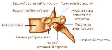 ГРУДНОЙ ПОЗВОНОК отличается большим, по сравнению с шейными, телом и почти круглым позвоночным отверстием.Грудные позвонки имеют на своем поперечном отростке реберную ямку, служащую для соединения с бугорком ребра. На боковых поверхностях тела грудного позвонка есть также верхняя и нижняя реберные ямки, в которые входит головка ребра.