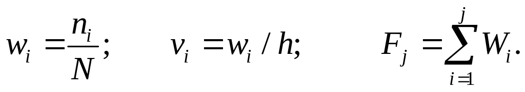 Вычислим относительные частоты, плотность относительных частот и накопленные относительные частоты.