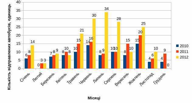 Рис. 3.1. Динаміка розвитку ТК «Селена-тур» за 2010-2012 рр. у розрізі відправлених автобусів