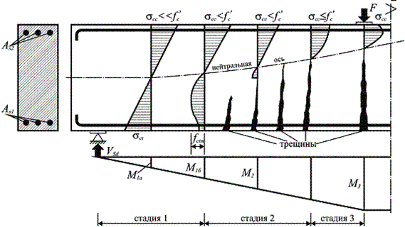 Рассмотрим стадии НДС нормальных сечений в зоне чистого изгиба при постоянном увеличении нагрузки.