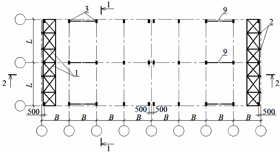 система связей: 1 – горизонтальные связевые фермы; 2 – стойки торцового фахверка;3 – колонны; 4 – стеновые панели; 5 – стропильные конструкции; 6 – плиты покрытия;7 – вертикальные связи на опорах стропильных конструкций; 8 – распорки по верху колонн;9 – вертикальные связи по колоннам