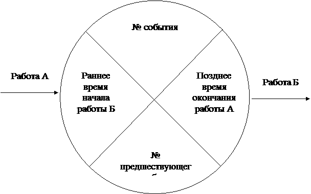 секторное представление временных параметров, то есть расчет параметров может быть произведен на самом графике. Каждое событие для этого делится на четыре сектора. В левом секторе события записывают раннее начало работы, в правом — позднее окончание, в верхнем — номер данного события, в нижнем — номер предшествующего события, из которого к данному событию идёт путь максимальной продолжительности. Имеет место, когда в нижнем секторе ставят номер события и верхний сектор не заполняют. Определённые резервы времени записывают под стрелкой в виде дроби: в числителе общий резерв, а в знаменателе частный резерв.