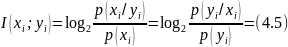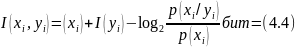 (4.4) бойынша, (хі, уі) жұп оқиғаларының ақпаратын тәуелсіз I(хі) + I(уі) жұп оқиғаларының ақпараттары арасындағы айырмашылық және Х және У дереккөздерінің байланысына тәуелді, алдын ала болжам қылынған I(хі, уі) өзара ақпараты деп түсінуге болады