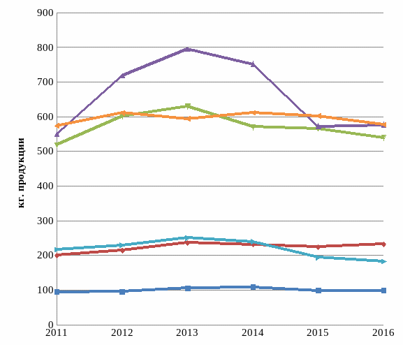 Как видно по данным рисунка 3, существенное снижение произошло в большинстве групп товаров в период 2014-2016 гг. Рост в 2016 году восстановился лишь по немногим категориям, в числе которых сахары и куры – бюджетные категории продукции. Говядина (как и рыба, как и свинина) продолжают пользоваться значительно меньшим спросом. Сокращается потребление молока, хлеба и рыбы. Последняя категория пользовалась значительным спросом в СССР как замена дефицитному мясу, однако сейчас мясо курицы дешевле в производстве, потому и пользуется большим спросом и в период 2015-2016 гг. потребление данной продукции выросло на фоне снижения большинства прочих групп товаров. Таким образом, индекс покупательской способности по отдельным категориям продолжает снижаться в период 2014-2016 гг, по отдельным – было снижение в период 2014-2015 гг, сменившееся ростом в 2015-2016 гг.